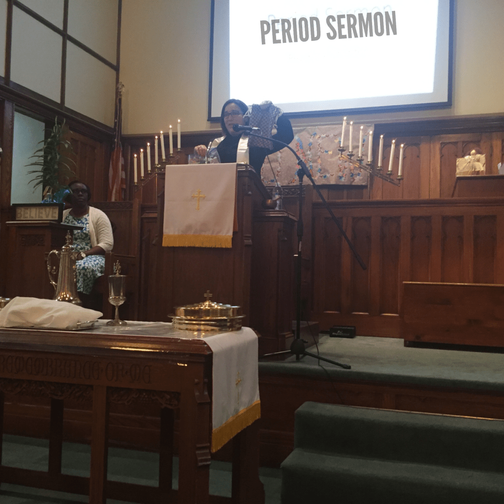 Choosing liturgy for the Period Sermon is a little challenging. Part of the issue is that the text from Leviticus does not appear in the lectionary. Most of the prayers, litanies, communion liturgies, sermon helps, etc. are based on the texts that are in the lectionary. What that means is when I’m preaching on a text that is not included in the lectionary, I have to do a little more work to find meaningful prayers or a lot more work to write my own. The text from Mark does appear in the lectionary but most of the ‘helps’ are geared toward the little girl who was raised from the dead and not the woman who was healed from her unusual and lengthy bleeding. Honestly, I didn’t expect to find much.