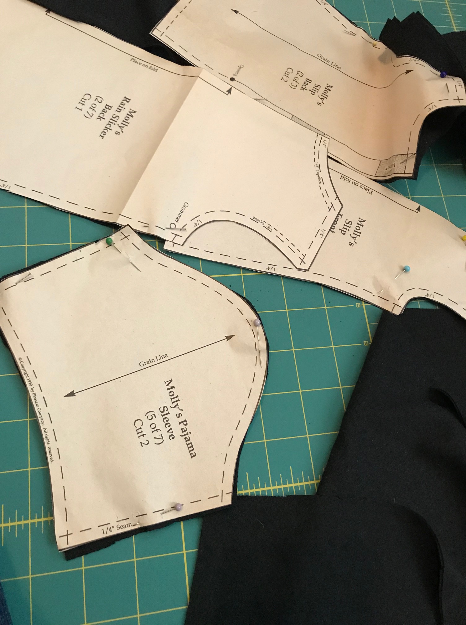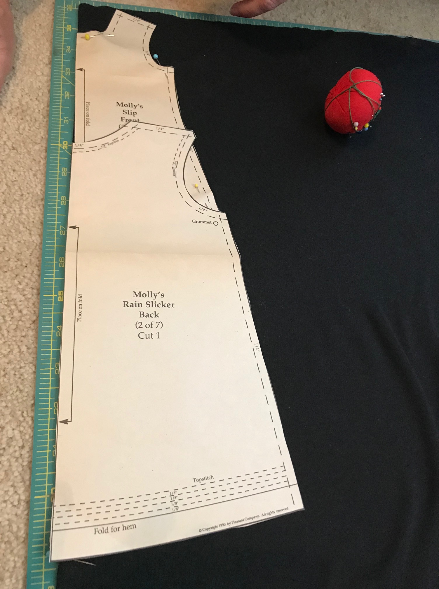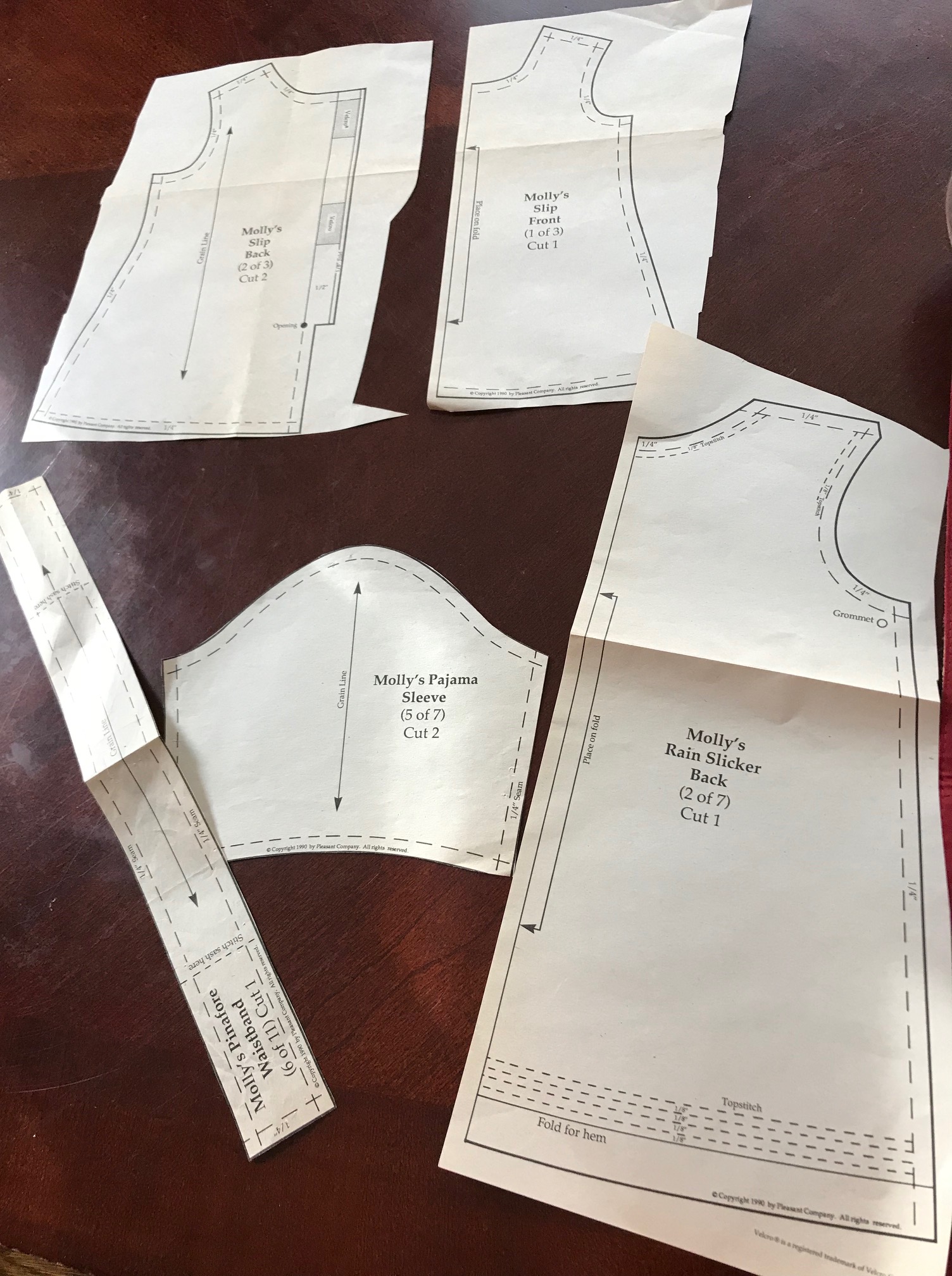 We went through the patterns and decided we wanted something that was a straight and plain as possible. Starting with Molly’s slip (front and back pieces) to get the fit we wanted. Then we used Molly’s rain slicker back to get the length we wanted. We cut the fabric narrow like the slip. Molly’s pajama sleeve was the smoothest sleeve (apparently gathered, puffy shoulders were Molly’s style). Mom cut down the “hump” part of the top of the sleeve, so it would not need to be gathered (making it puffy) before being attached to the slip top. She cut without measuring so you’ll have to eyeball it too. My Molly doll had been wearing her pinafore prior to this adventure which is what gave us the idea to use the pinafore waistband to make the collar. It ended up being the right width, but we had to make take some tucks (in the back) to make it fit as close as we wanted it to. You will have to make that decision too, it wasn’t an exact measurement. We decided the white tab should be about an inch. It was handstitched onto the collar.