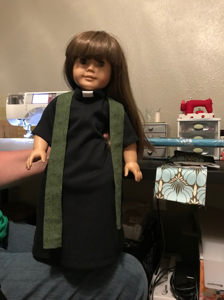 I was scrolling through Pinterest one day and came across a picture of the American Girl Doll, Molly (the one I received when I was 9 years old) dressed in clergy apparel. Alas, no link for patterns. I called my mom and we decided we could make it work with the patterns she still had at home. She purchased the patterns in the early 90s and I couldn’t find them on the American Girl website again or I would have linked them here for you. I did a quick google search and found American Girl Doll Patterns and Free American Girl Doll Patterns that seem to be helpful if you have to start without any patterns from your mother’s basement.