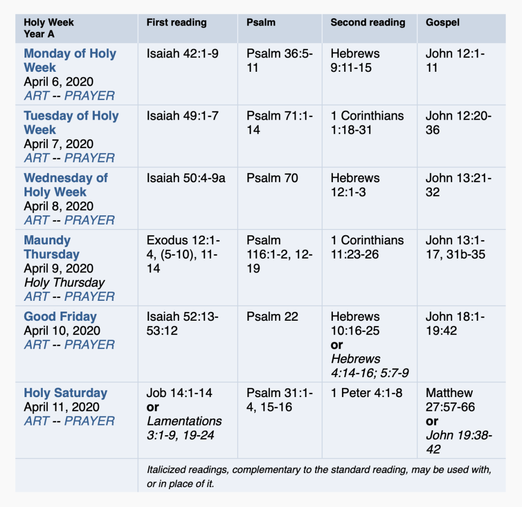 Here are the reading options: Most churches who follow the lectionary use RCL and are on Year A, even those who don’t follow the lectionary strictly usually use lectionary texts for Holy Week. I’ve included what Remembering the Women suggests for adding in texts to the lectionary (year A) for a more feminist feel. Third Church has chosen to go with Year D which is molded after the RCL; its goal is to include texts that aren’t included in the other three years. I like getting to hear/read these other texts but preaching on them is sometimes challenging (perhaps a reason these texts were left out of the three year rotation). Game for Good Christians Revised Uncommon Lectionary is a funny book but the readings themselves are not. Maybe I’ll write those up later.