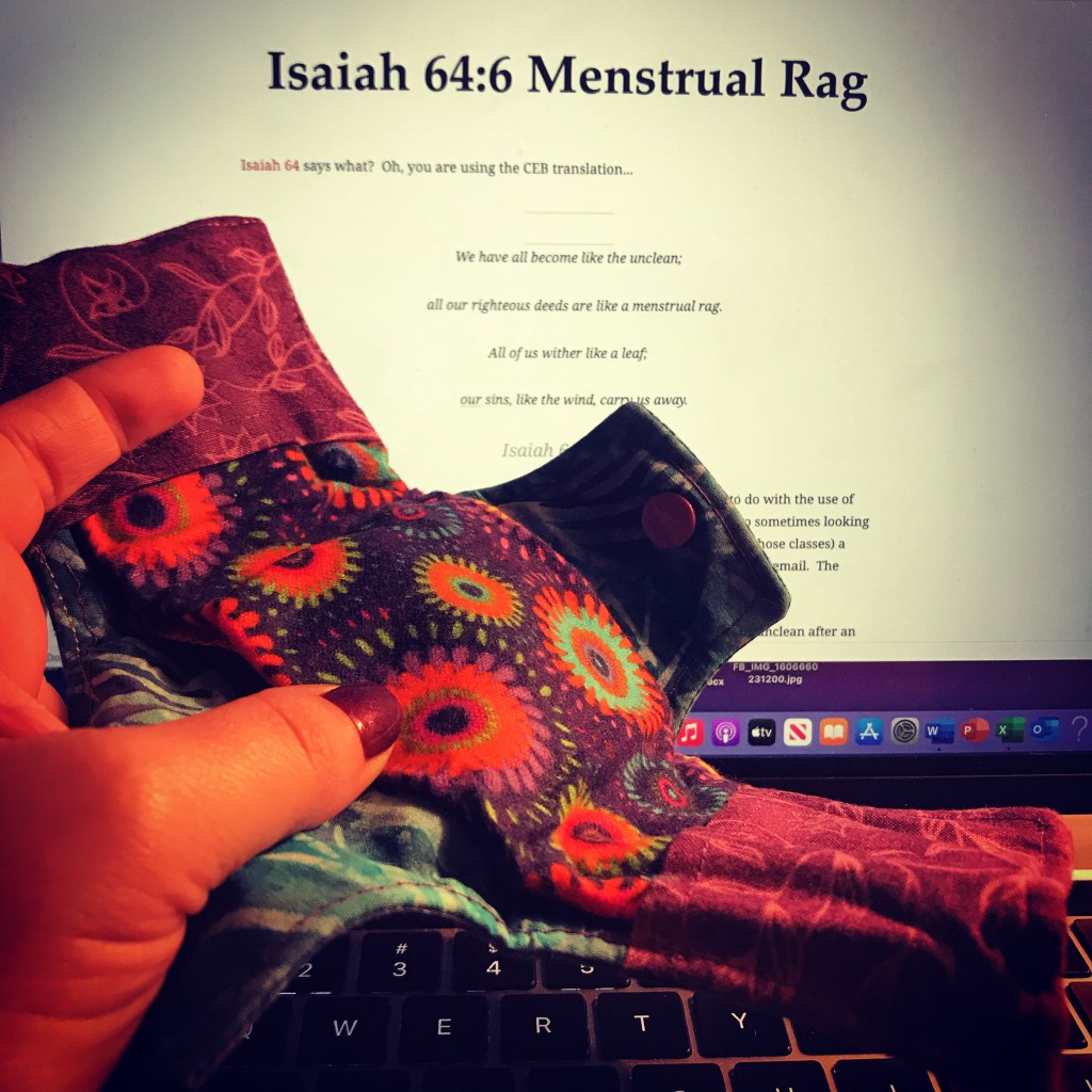 Have you ever had one of those weird moments when you opened to exactly the right page in a book? So, in looking for Isaiah 64, I opened to the section on Isaiah 8:1-4 in the women’s bible commentary. It mentions that Isiah’s wife’s name is the feminine form of the word for prophet (navi’). And while we don’t have any prophecy’s attributed to her, we do know of five other women who carry the title of prophet. “…Miriam (Exod. 15:20), Deborah (Judg. 4:4), Huldah (2 Kgs. 22:14), and Noadiah (Neh. 6:14). Not one eyebrow is raised as these women’s vacation are mentioned, and the words of three of them are recorded (Exod. 15:21; Judg. 4:6-9; 5:2-31; and 2 Kgs. 22:15-20). The presence of female prophets in ancient Israel suggests that it is quite likely that at least some of the contributors to prophetic books were women.” (p. 259) And wouldn’t stand to reason that if there were women prophets that they might use imagery specific to womanhood? Menstrual rag? Well, after turning enough pages I found that the women’s bible commentary did not specifically mention Isaiah 64’s menstrual rag, nor did any of the other commentaries on my shelf (but my collection is far from extensive). So, if you have something insightful leave it in the comments. Is there an old testament understanding of menstrual rags? Is this metaphor used elsewhere?