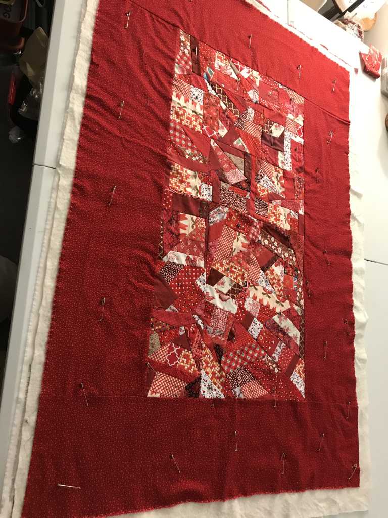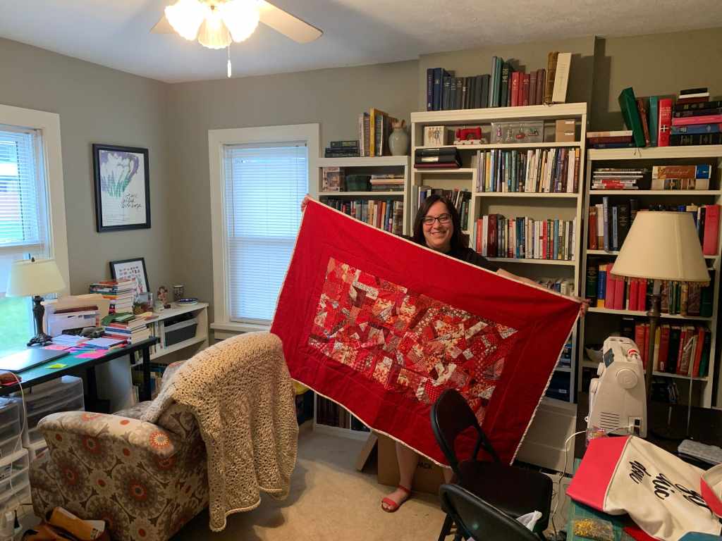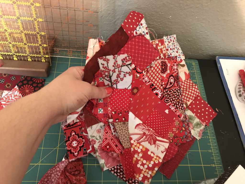 I chose the red scraps for what by now are obvious symbolic reasons. I choose to make this quilt out of scraps to also have a chance to think about the relationship between repurposing and redeeming. The pieces of fabric represent pieces of life. Some are beautiful and some are not. None of them the same shape or size. The fabric reminds me of what was made first or what was intended to be made. Some of the fabric I’ve inherited. As the scrap bin overflows, in the sewing room and in life, I wonder what changes are necessary to create less waste to lose less material to the bin, and what can be come out of the trash heap that was rejected from the “good” project to become something purposeful and beautiful. What pieces of my broken past are redeemable? Can all mistakes and sins be mended? What makes something or someone “good as new”? Perhaps there is room for repair and room for a new process (so there’s less waste) and perhaps that new process is formed in spiritual formation classes. In piecing together this quilt, I am piecing together my spiritual autobiography (yes for the previous class) and piecing together my sense of spirituality and my sense of call.