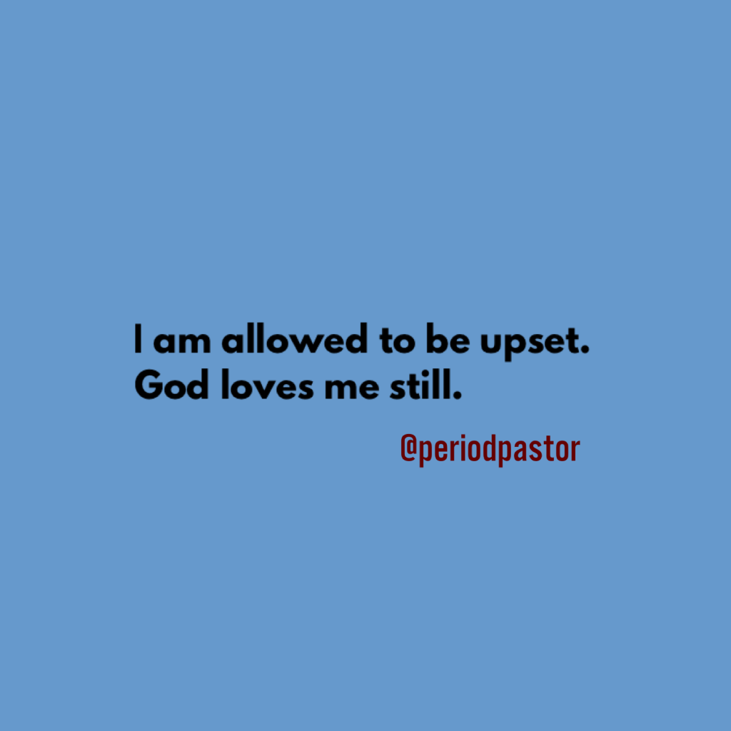 Or you may want to use a short phrase: I am allowed to be upset. Grief does not shake my faith. My feelings are valid in prayer. God loves me still.