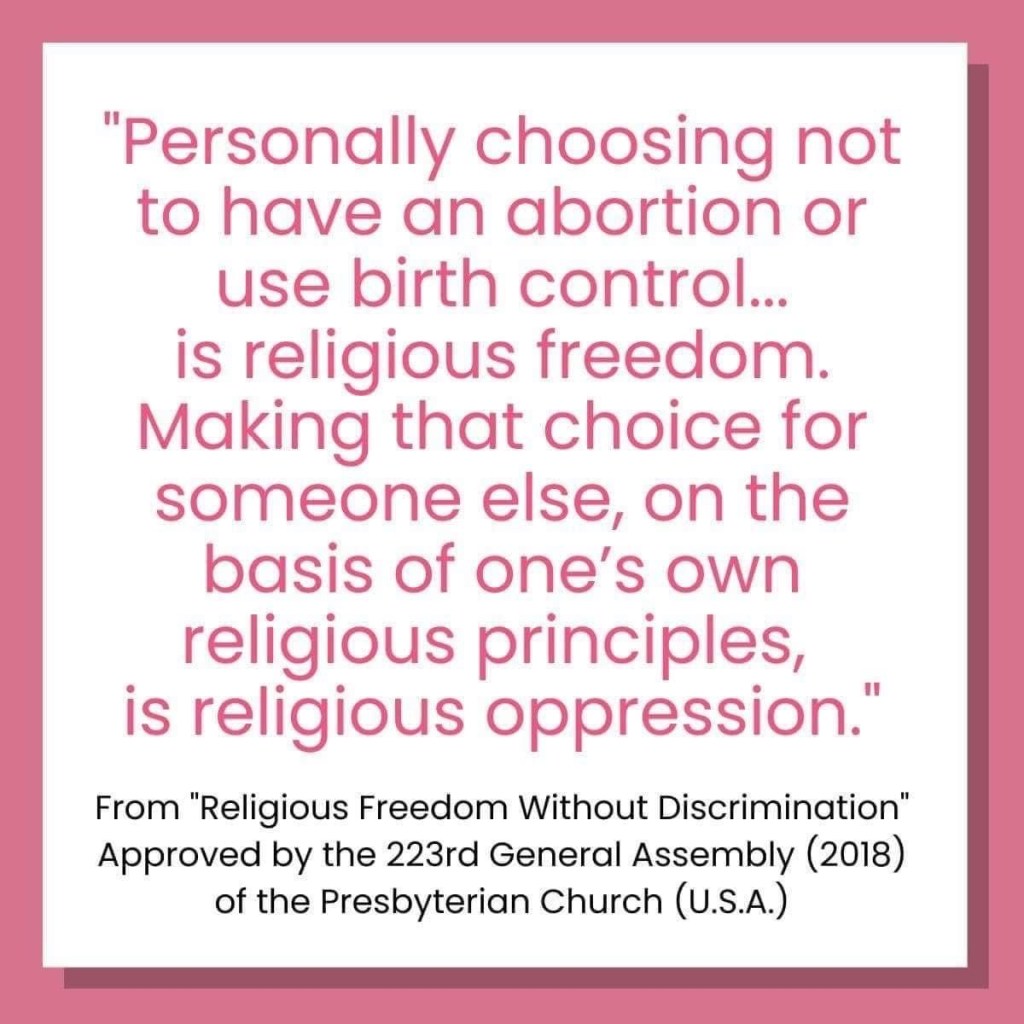 “Religious Freedom Without Discrimination” was approved by the 223rd General Assembly (2018) of the PCUSA, this section feels particularly important: “Presbyterians have historically valued religious liberty and continue to support the freedom to act according to one’s religious beliefs. However, in cases involving the refusal of goods and services, false claims of “religious freedom” cause direct harm to those who are denied access. Legislating such claims as cases of protected religious freedom would undermine years of progress in state and federal civil rights and anti-discrimination law. The key distinction lies in whose choice is being limited or protected. Personally choosing not to have an abortion or use birth control, for example, is religious freedom. Making that choice for someone else, on the basis of one’s own religious principles, is religious oppression—as is done when an insurance company denies health care coverage for birth control or a doctor refuses to prescribe contraceptives. Using one’s own idea of “religious freedom” to limit the lawful choices of others through your own economic leverage creates a dense pattern of religiously sanctioned discrimination.” The document also contains specific examples of Reproductive Health Care and LGBTQ rights that are challenged under the banner of religious freedom but are actually forms of religious oppression.
