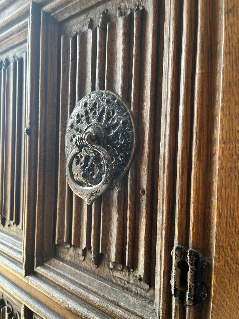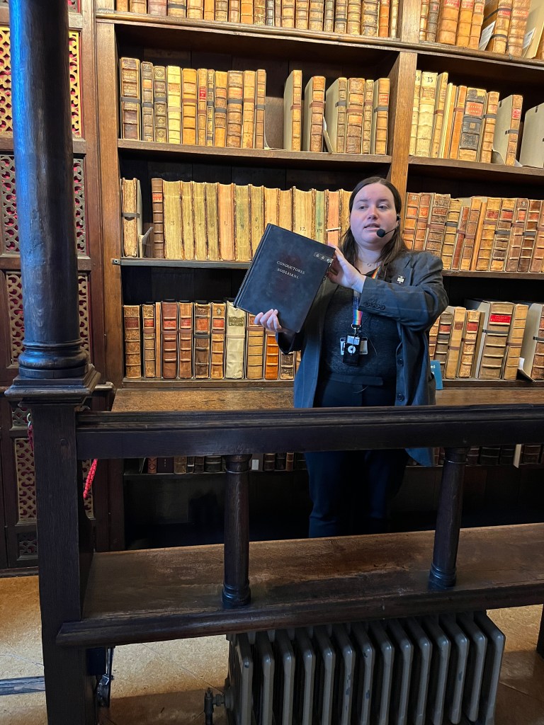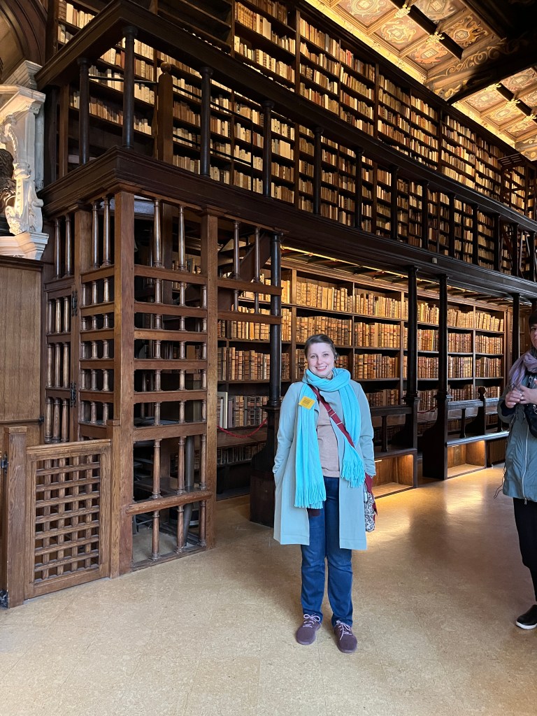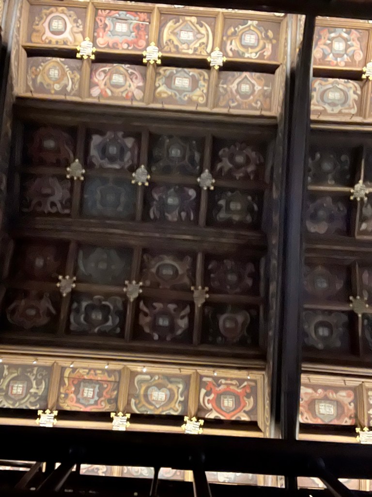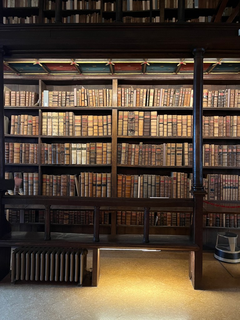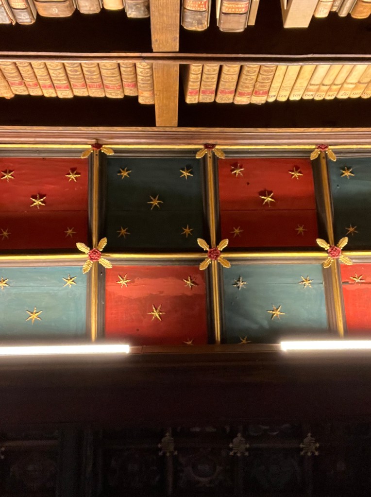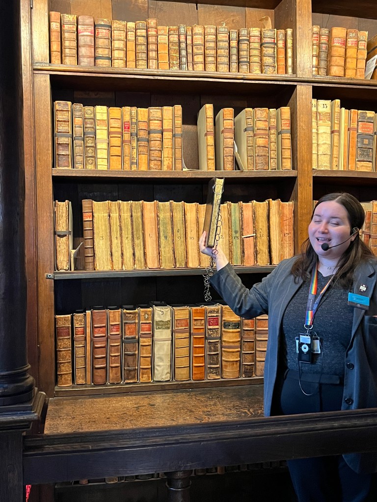 The tour included a demonstration about how the books were chained to the shelves to prevent them from being removed from the library. (The books are still not allowed to be removed from the library today.) Our guide told us that what the movies get wrong is that the chains were attached to the covers not the fragile bindings. They would have been shelved with the spines facing the back of the shelf. Some books had marks on the pages, but the librarian was always consulted when a book needed to be found. The librarian would look up the book’s coordinates and find it by shelf, and position on the shelf. The reader would sit at the bench in front of the shelf (that the chain would allow) to read the book. The library was cold and dark in the early days and students would be very uncomfortable studying as long as daylight or candle light allowed. Today, the library is a pleasant place.