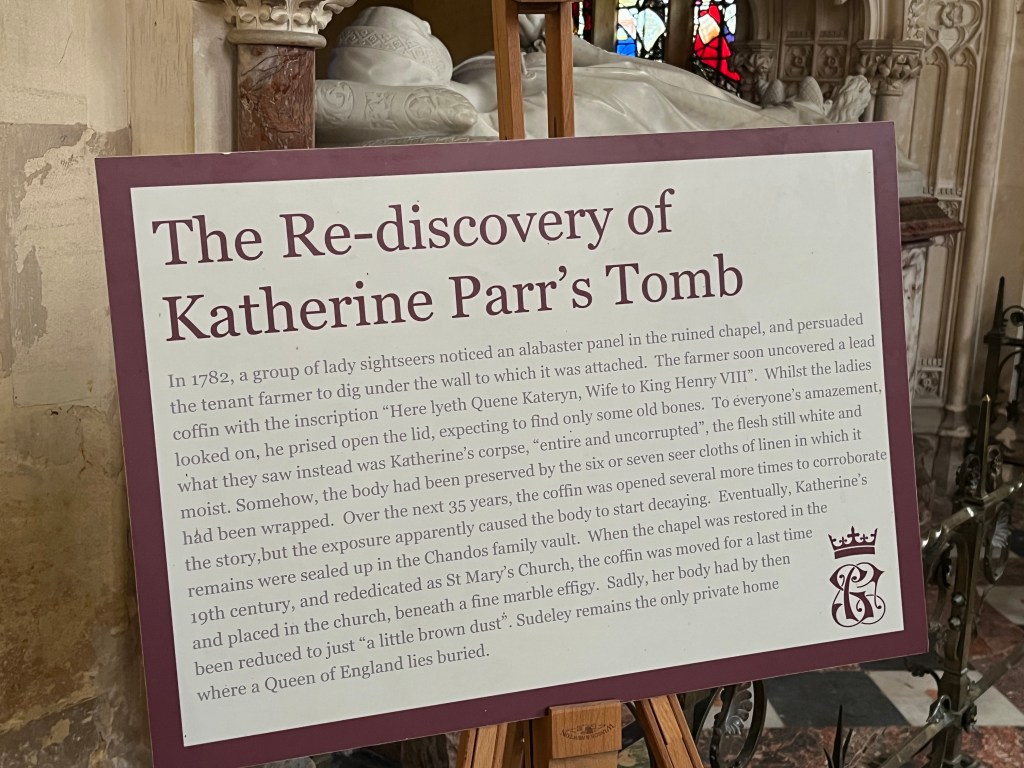 We visited Sudeley Castle and the Cotswold Villages. Katherine Parr (Kateryn) was the first English woman to be published under her own name. She was the first English Queen to have a protestant burial and the only English Queen to be buried on private property. As Henry VIII, last wife, Kateryn encouraged both Mary and Elizabeth to publish under their own names as Kateryn had done. She moved to Sudeley Castle when she remarried after Henry VIII’s death. In 1548, she died in child birth. There aren’t many records of her daughter so there is some speculation about if she died or lived a quiet life. In 1782, after years of neglect, interest in Sudeley Castle grew and her tomb was discovered in the chapel. When they opened her grave they discovered she was uncorrupted but they did not reseal it properly so she did decay.