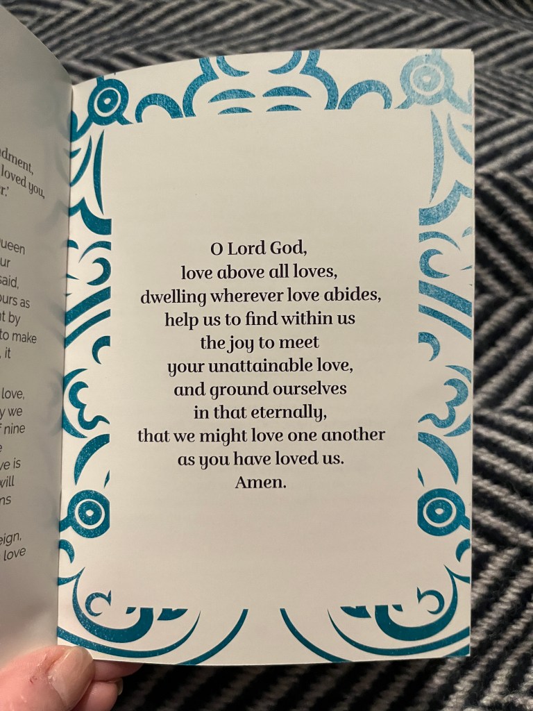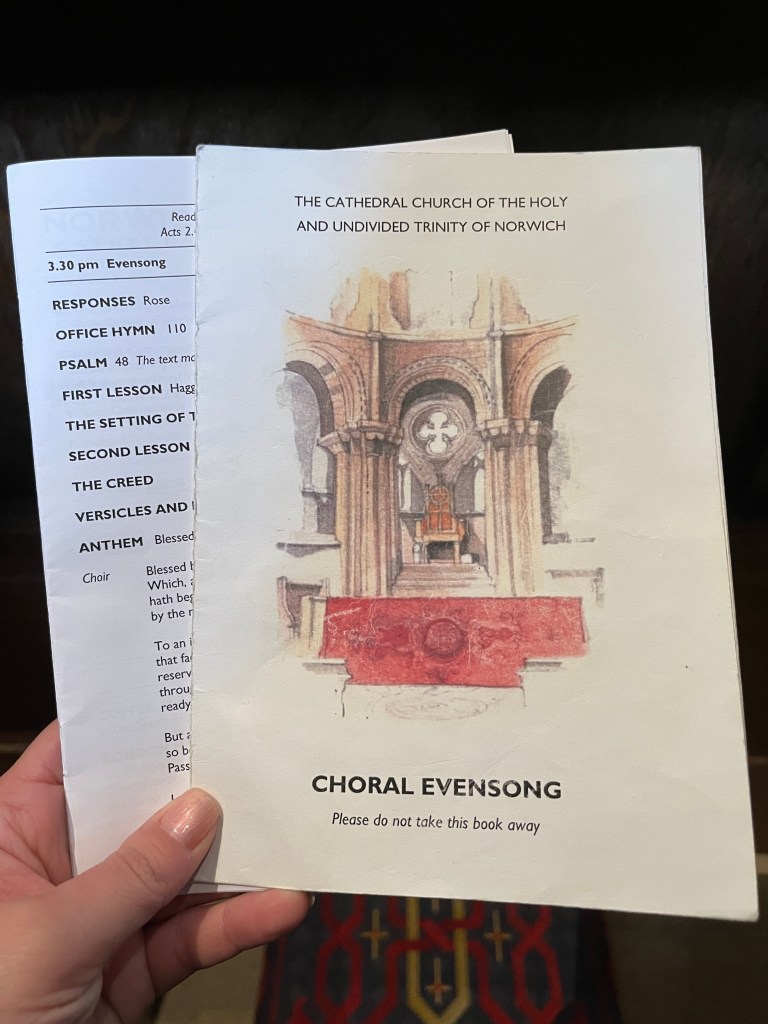 As with the Italian Pilgrimage and the Ecuador DfG trip, I prepared a small journal to take with me. I copied the dedication to Lucy Barfield from The Lion, The Witch, and The Wardrobe on the front page. I copied program notes from the broadway musical SIX and glued them into the book. It was a really fun musical, I highly recommend. I have a couple pages of notes from reading the Katherine book, a few pages of C.S. Lewis quotes, some prayers and poems that felt fitting for the pilgrimage, and I printed a “all shall be well” quote and glued it in, reminding myself to leave some space for Julian notes when I began journaling about the trip.