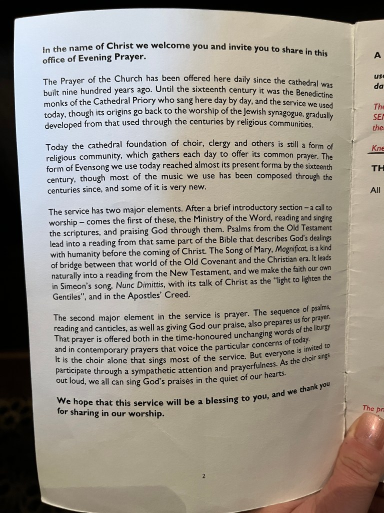 I am struggling, even as I write this, I know I’m getting better each day. As I look back on my time preparing for this pilgrimage, I am aware that I was unable to prepare as well as I had for the Italian Pilgrimage. I took one class somewhere near the beginning of the pandemic on Julian of Norwich and read sections of her showings then, so I felt, that was the part of this pilgrimage I was most prepared for (but it was our last stop). I was (and still am but to a lesser extent) struggling to read and write. Both of these are essential to my job and my own devotional life. I can’t remember the last time I read for fun.
