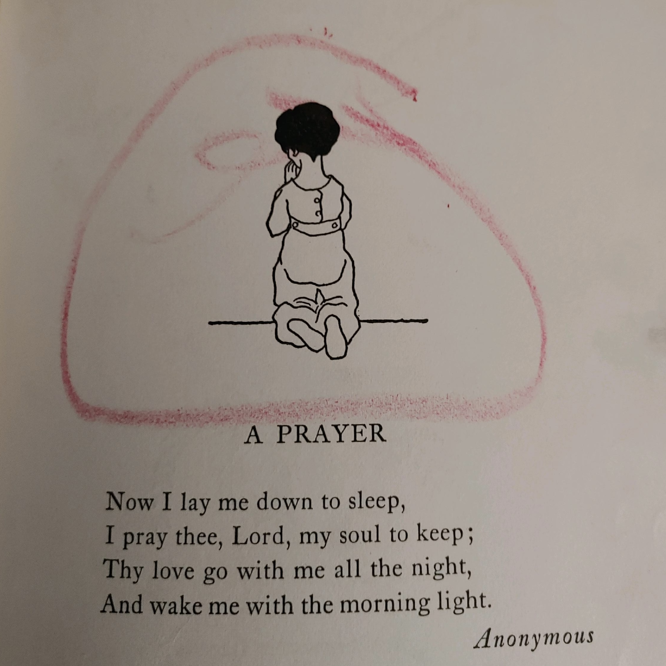Memories aren’t always accurate and I thought the original sounded version of now I lay me sounded familiar but I also remembered the line about angels. I asked mom and found out that she taught my brother and me to say “Now I lay me down to sleep, I pray thee Lord my soul to keep; Angels guard me through the night and wake me with the morning light”. She told me that’s how her mother taught her and that she remembered reading it in a book and sent me a picture of that prayer with a slightly different third line “Thy love go with me all the night”. She tells me that it was one of her siblings that added the red crayon; she can’t remember who, but is sure it wasn’t her.