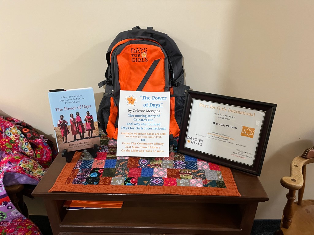 Celeste’s book is displayed prominently along with how to buy it or where to borrow it locally at two libraries near by (East Main Church Library and the Grove City Community Library). East Main Church was the original host for the Grove City Team and continues their support of DfG. The Gove City Library keeps a period pantry so that students can access free menstrual products over the summer. The Gove City DfG team helped to set access to period products in the local schools and knew that community buildings like the library and YMCA would be important locations for period pantries especially in the summer months.