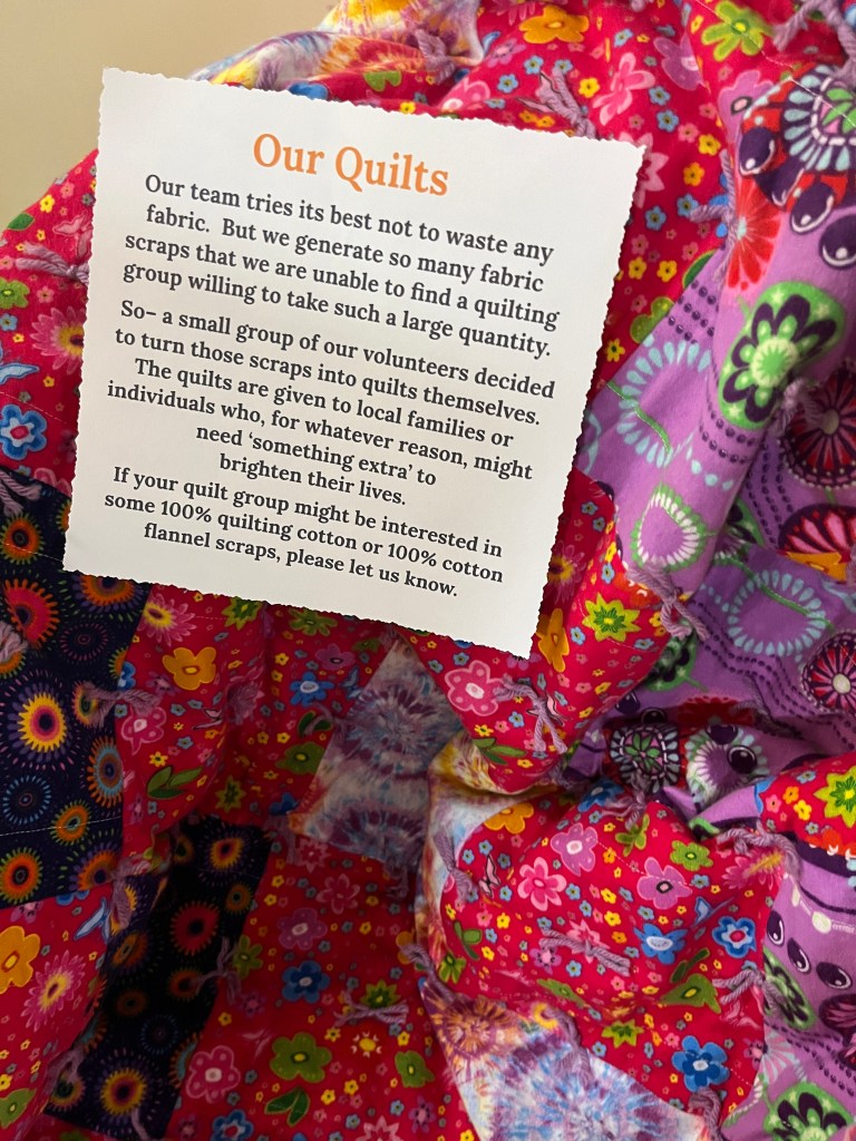 The Grove City DfG team has connections with local quilting guilds (some ladies are quilters and DfG volunteers) and they help produce beautiful quilts from fabric that can’t be used for DfG components. I’ve given them some of the ‘not fit for purpose’ items from the collection point to be used by quilters and to make these beautiful blankets that are donated to those who need them. I’m so glad that we can repurpose items for such a wonderful cause.