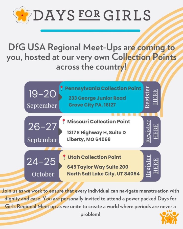 We hope to see you at the Days for Girls Regional Meet up in PA on September 19th and 20th. DfG Registration links are at the end of this post.