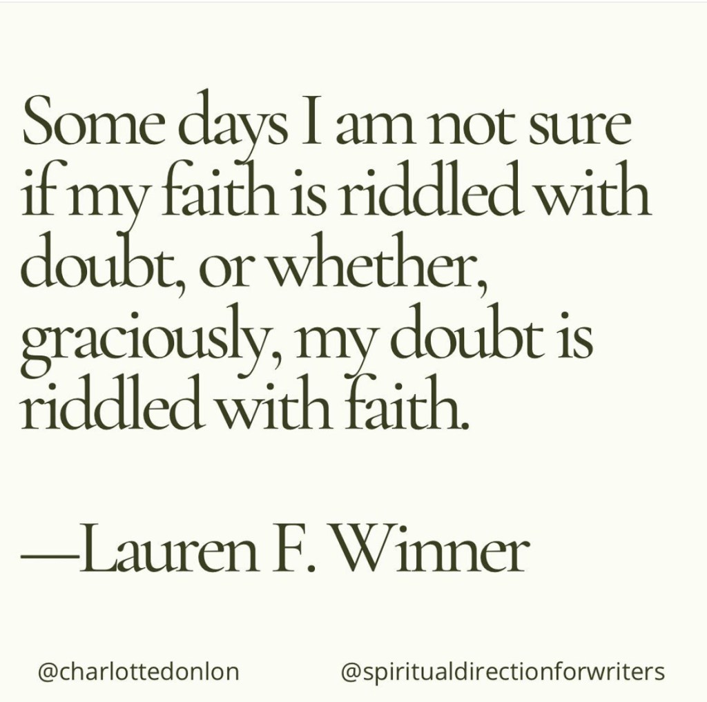 Sometimes I think of faith and doubt as conversation partners. I am one person at the table with Faith, Doubt, and God. When I talk to Doubt, the conversation is full of worry and fear. It reveals what I am concerned about and as I question doubt, it reveals a wounded part of me, a part that needs to be healed. On my best days, I can treat those wounds with love. When I talk to Faith, the conversation is full of hope, hope that all things will be well. This inspires me to work towards justice, mercy, peace, and new life. But Faith is often exhausted and doesn’t know where to start. God is a loving presence throughout the conversation. After Doubt and Faith have run out of things to say, we listen for God’s voice. Sometimes we get an idea or new clarity on our situation that seems divinely inspired. Sometimes we just feel like we’ve been hugged. I always leave the conversation with a sense of being deeply loved.