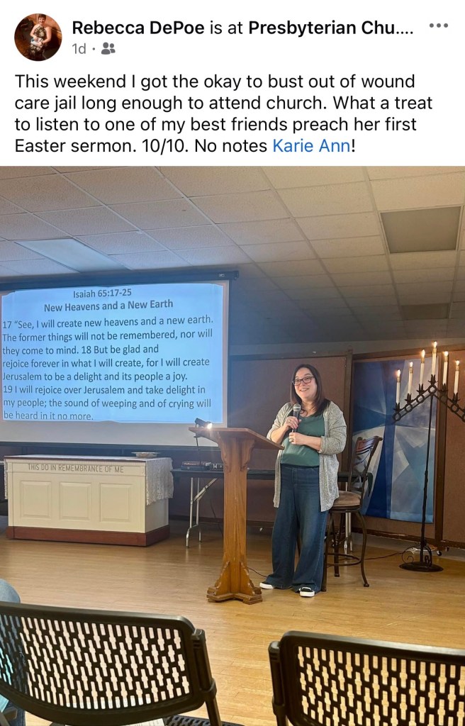 So thrilled that Rebecca’s healing is progressing well enough for her to attend services. Insurance will only cover her wound dressing changes if she is home bound. She found out that homebound patients are allowed to attend worship services but leading them would constitute “working”. Her people were thrilled to see her. I love seeing her, and I was a little nervous to preach my first Easter sermon in front of her. But that was silly. I have such a wonderful and supportive friend (check out her facebook post above). As an associate pastor, I’ve never had the opportunity to preach on Easter (or Christmas), so this weekend felt like a milestone in ministry.